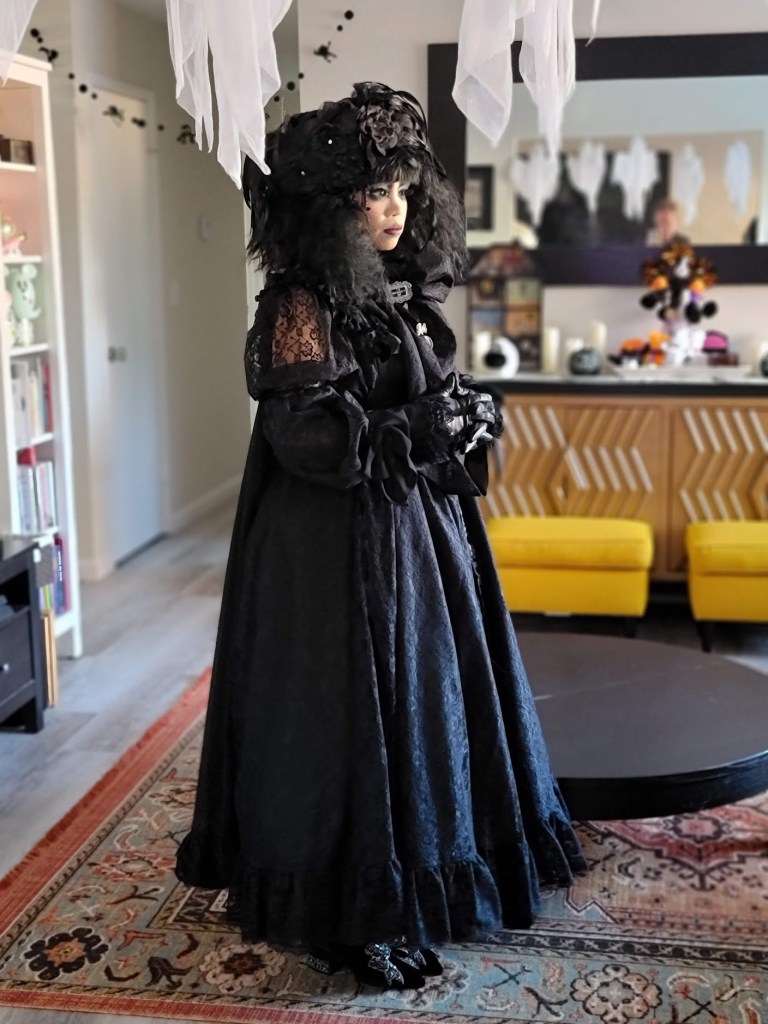 I find this dress difficult to photograph in a way that does it justice. There are multiple layers of fabrics, with the top being lace. It is a sack dress but if you wear a harness it turns it into a high waist dress. The amount of fabric used for the skirt is pretty generous, and one could wear it without a petticoat but I wanted to wear one in this instance. The sleeves are reminiscent of the leg of mutton sleeves like the costumes worn in the movie. In the back there is a long cape that is attached, which adds another dramatic layer to the garment.