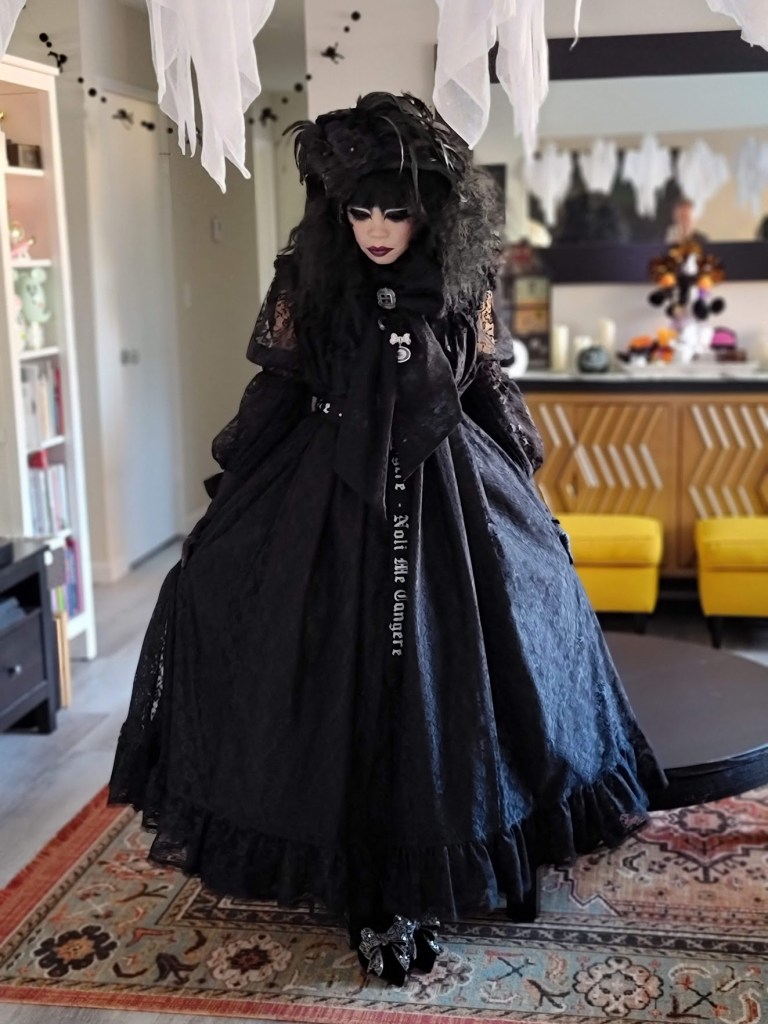 I am not a historical costumer, but there are many overlaps when it comes to these garments and what I like to wear. I like to wear them when it suits my fancy, and it may or may not be the correct era. I wore this brooch with this outfit as kind of a reference to victorian era mourning wear.