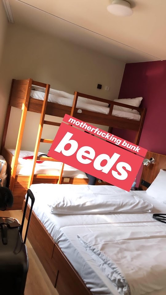 Here are a couple photos of this hotel room. Super small! I got bottom bunk! Our suitcases pretty much took up all the rest of the space.